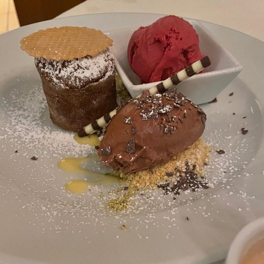 Wie wäre es zum Abschluss mit einem Schokoladenküchlein, einer Kugel Eissorbet und einer Nocke vom Schokomousse?