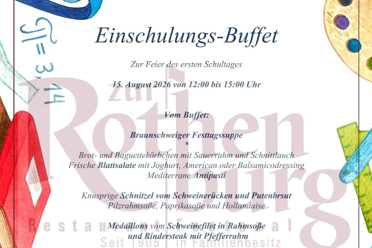 Einschulungs-Buffet am Samstag, 15. August 2026, von 12:00 bis 15:00 Uhr, für 39,50 € pro Person, 19,50 € für Kinder unter 12 Jahre.