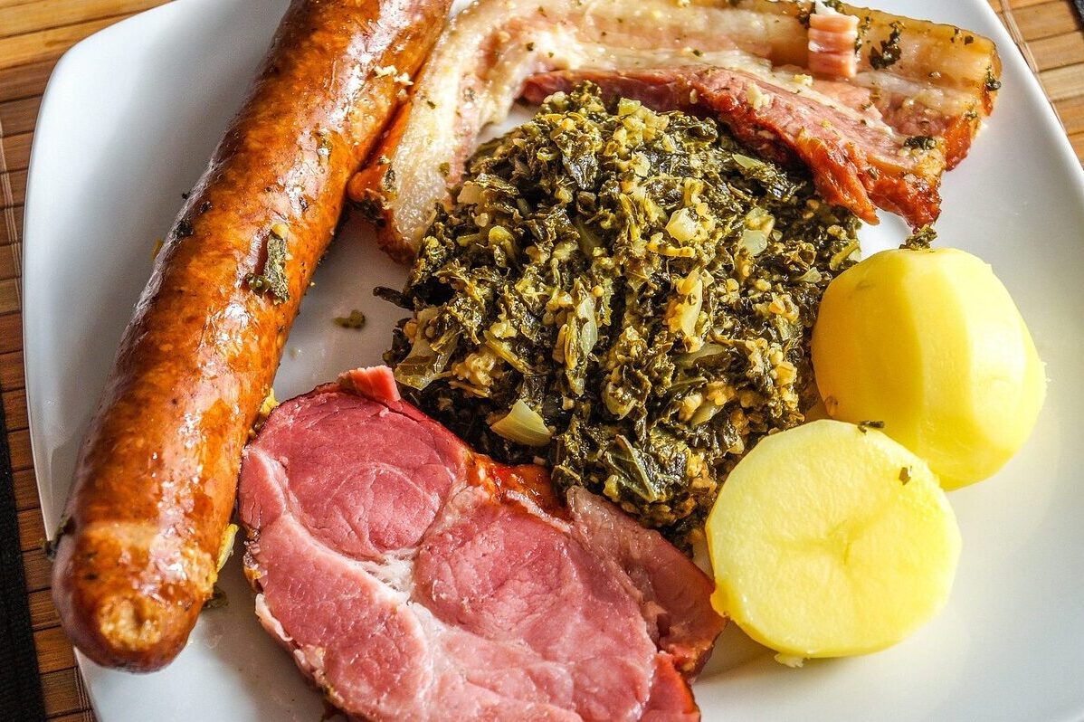 Braunkohl mit Bregenwurst, Bauchfleisch und Kasseler – jeweils mit Salz- oder Bratkartoffeln und Senf, für 24,50 Euro pro Portion.