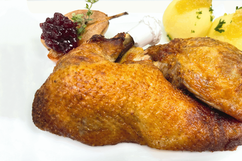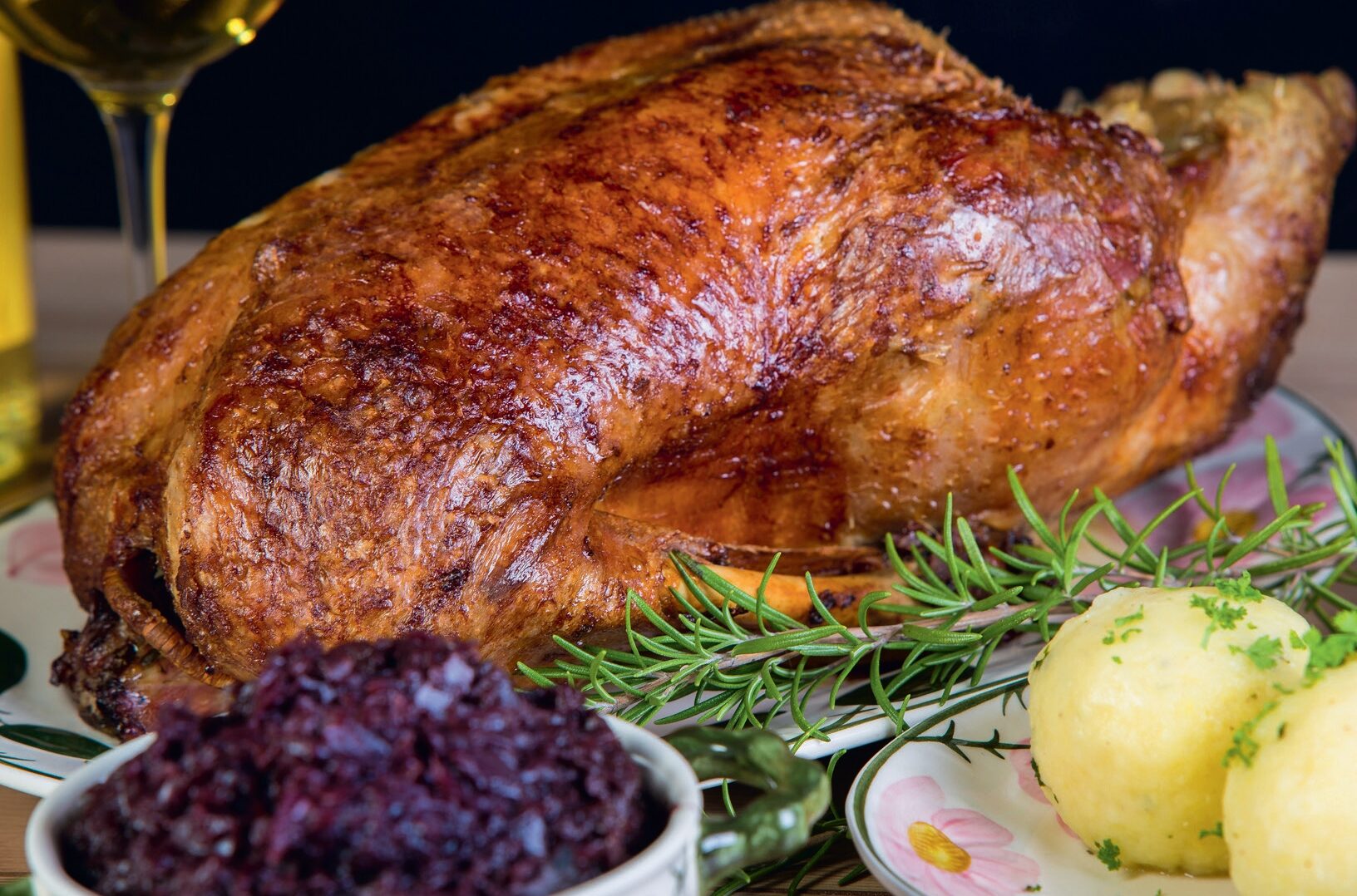 Frisch aus dem Ofen und an Ihrem Tisch zerlegt – mit den klassischen Beilagen (Rotkohl, Rosenkohl, leckerer Bratensoße, Kartoffelklößen oder Kroketten) – zur Auswahl.