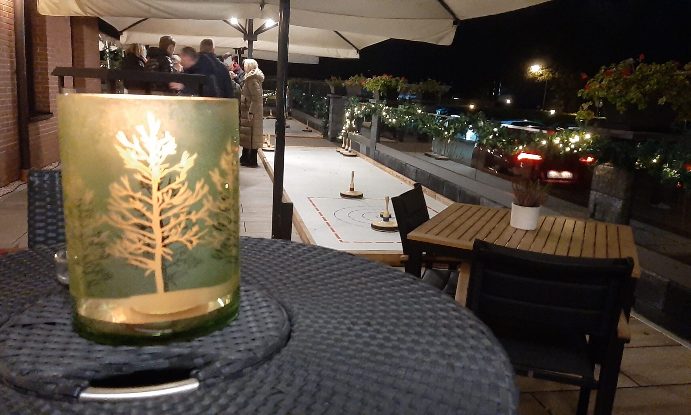 So weihnachtlich geschmückt präsentiert sich unsere Terrasse in der Zeit von November bis Januar. Mit den beiden Eisstockschießbahnen als besondere Attraktion dient sie bei vielen Weihnachtsfeiern als Einstieg in einen schönen Abend.